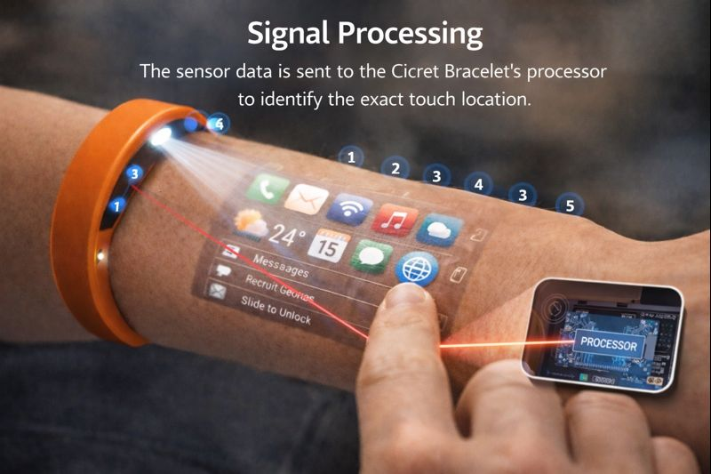 The blocked sensor detects the exact touch position and instantly sends this information to the internal processor inside the Cicret Bracelet.